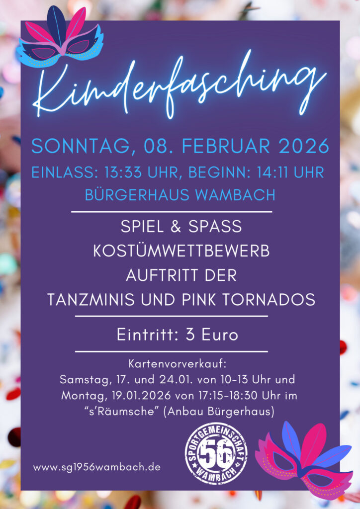 Kinderfasching am Sonntag, den 04.02.2023 im Bürgerhaus Wambach – Eintritt frei und Einlass ab 13:33 – Beginn: 14:11